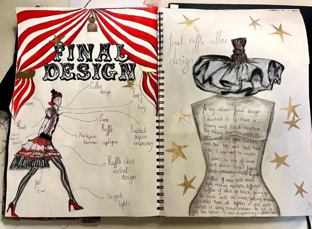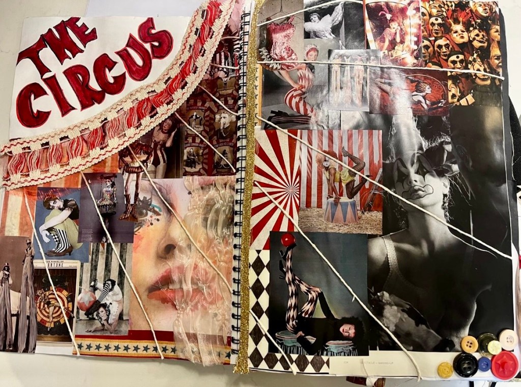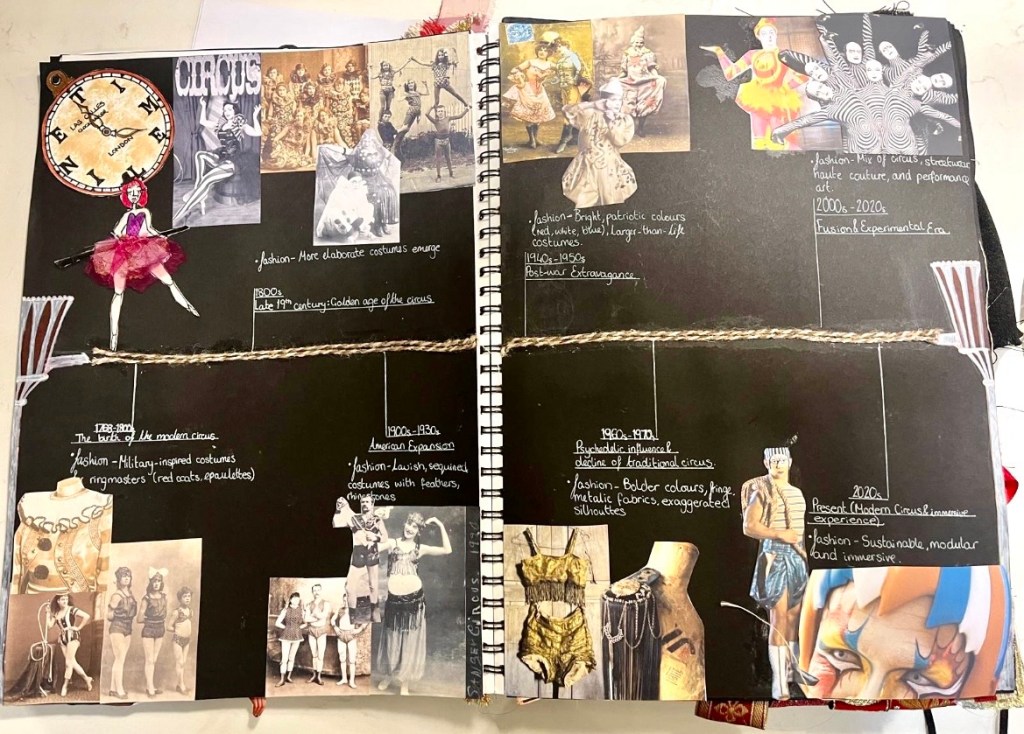 I explore fabric, texture, and craft through fashion projects, blending technique with storytelling to shape thoughtful concepts. I love quirky themes such as Circus, Kings and Queens and art nouveau. There are 3 themes I have included to show my creative process , there is a variety of media including photography, which i love.