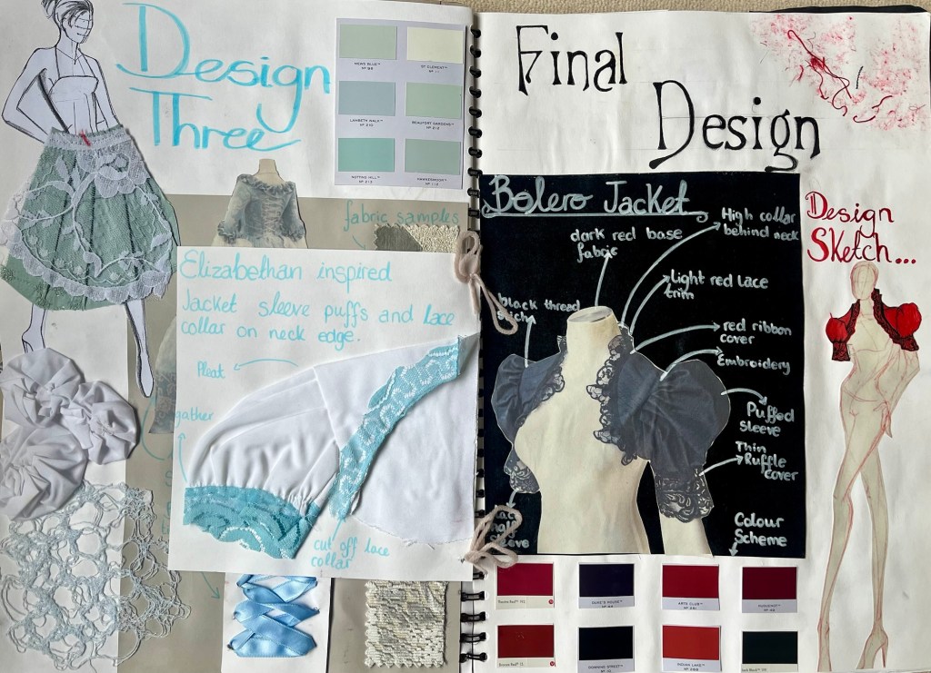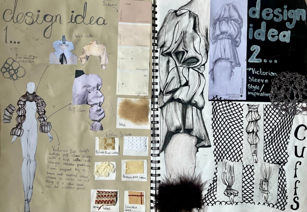 There are my final design pages where I put together all my past research and sketched my final piece that I would be making. I decided to go for large puff sleeves and use quite gothic colours with added embroidery detail and lace trims and beading.